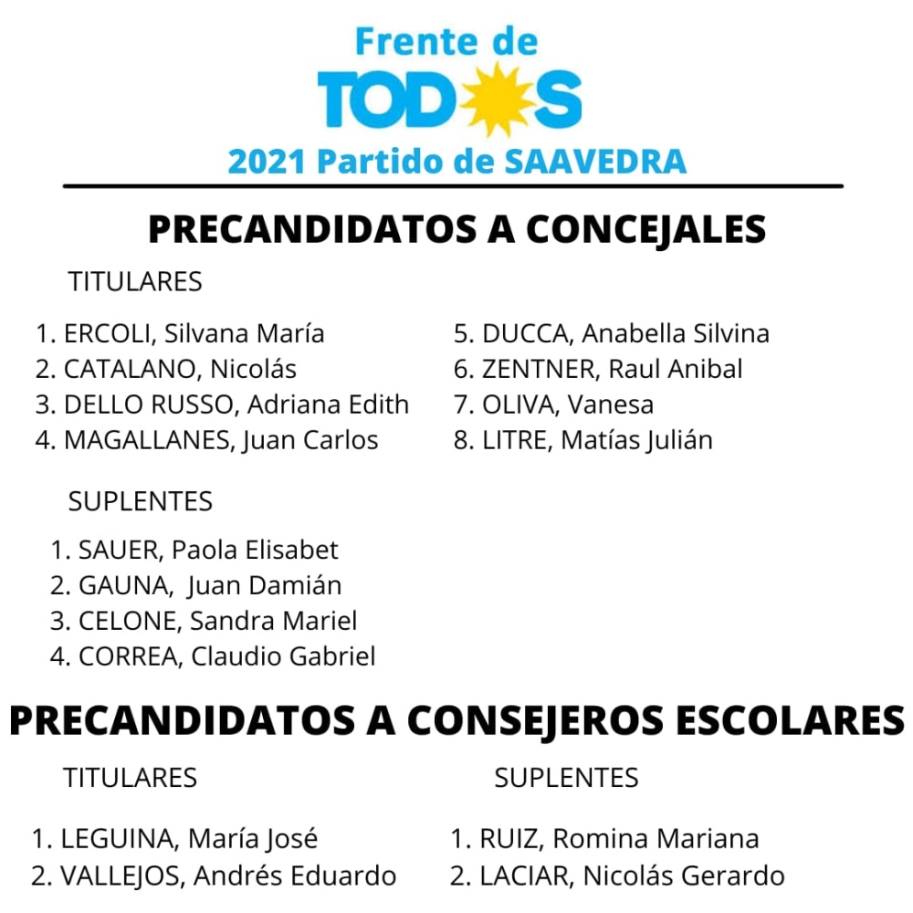 El sábado venció el plazo para la presentación de precandidatos de cara a las PASO. En el distrito de Saavedra hubo seis fuerzas políticas que presentaron listas. De ellas, si logran el piso del 1,5% de los votos en las primarias del 12 de septiembre, cinco podrán competir en las generales del 14 de Noviembre, dado que hay una interna en el peronismo con las listas que encabezan la Lic. Silvana Ercoli con el "Frente de Todos" y la Lic. Leticia Iacovelli con el espacio "Todos".