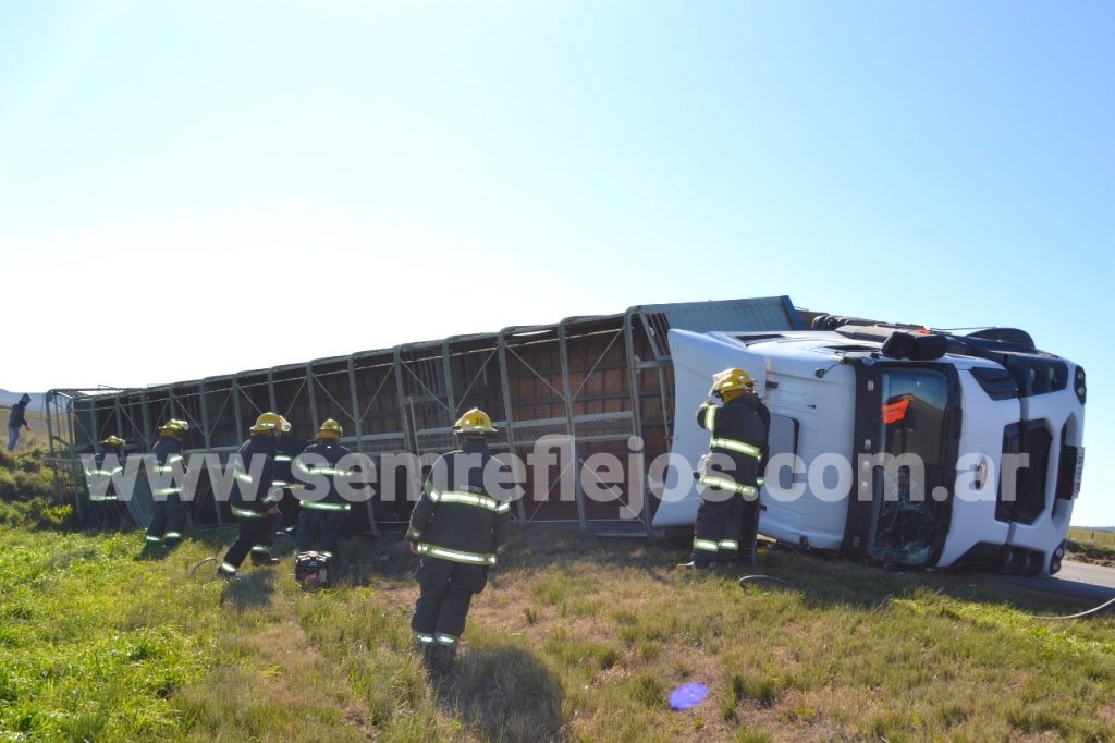 En la tarde de hoy cerca de las 14.00hs. se produjo el vuelco de un camión cargado de hacienda a la altura del establecimiento "La Tigra" en la Ruta 33. El incidente se produjo cuando el conductor del camión que venia de un camino rural al intentar subir a la ruta colisionó contra la alcantarilla. El mismo fue traslado al hospital por precaución y bomberos trabajan en el lugar para liberar la hacienda atrapada, se informa circular con precaución en la zona.