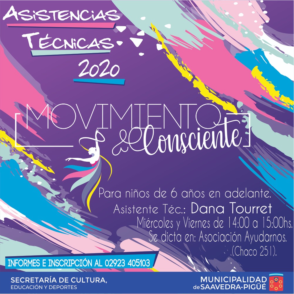La secretaría de cultura informa que está abierta la inscripción para la asistencia técnica de Movimientos conscientes. Está destinada a niños desde los 6 años y la coordinadora es Dana Tourret. Se dicta los miércoles y viernes de 14 a 15 hs. en la asociación Ayudarnos, Chaco 251. Informes e inscripciones al 405103.