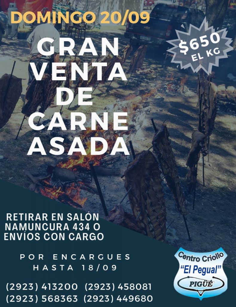 El Centro Criollo El Pegual anuncia una venta de carne asada para el domingo 20 de septiembre.