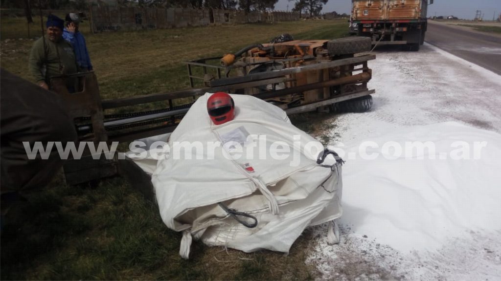 Según pudo recabar este medio, hoy temprano en la mañana un semirremolque que transportaba productos de Solvay de Bahía Blanca, se le cayeron algunos bolsones en la ruta 33 frente al autódromo Ciudad de Pigüé.