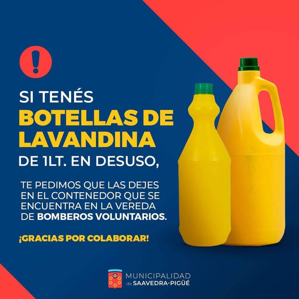 Los Bomberos del cuartel de Pigüé, están recolectando envases vacíos de lavandina de 1 litro. Los mismos se utilizan para fraccionar y abastecer a muchas familias del distrito. Quienes puedan colaborar, pueden depositarlos en el contenedor que se encuentra en la vereda de Bomberos Voluntarios.