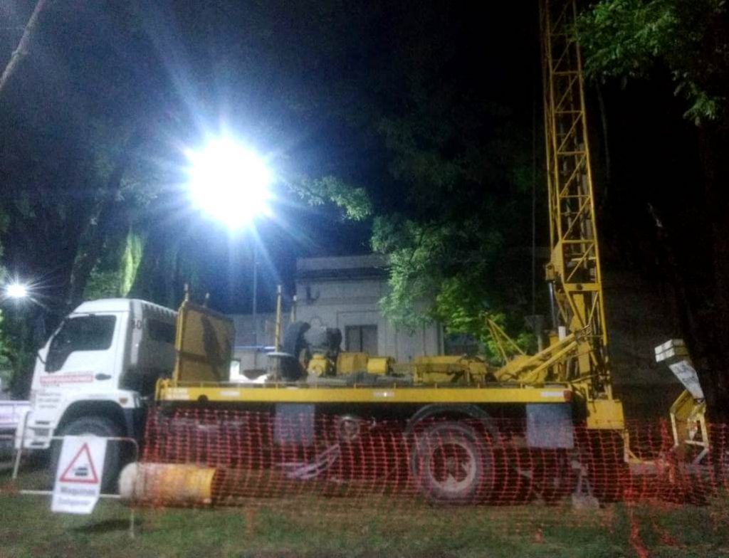 Alli la empresa Dulsan está realizando una perforación en el boulevard a pedido de la empresa Camuzzi Gas Pampeana. En el lugar se encuentra un obrador con personal y maquinaria trabajando.