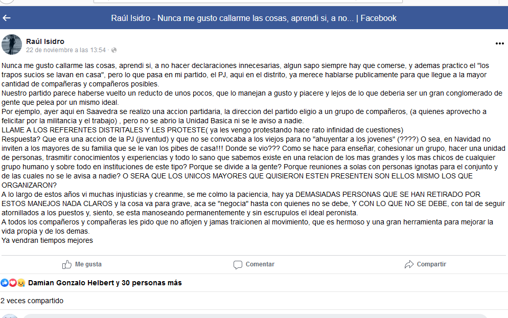 Una dura crítica hacia el partido peronista del distrito de Saavedra, publicó hace unos días en sus redes sociales, el conocido militante justicialisa Raúl Isidro.