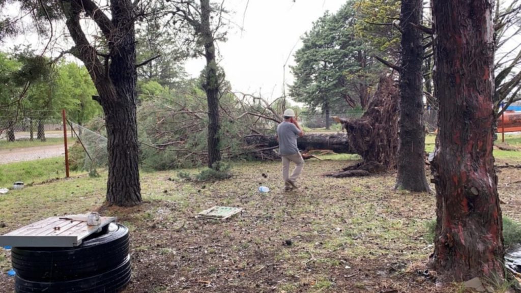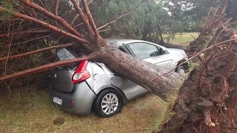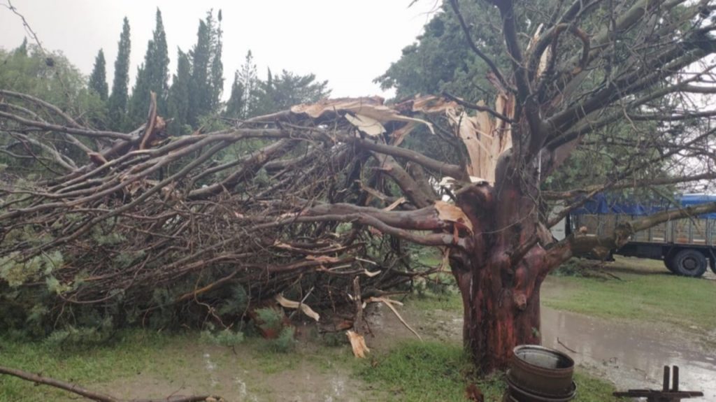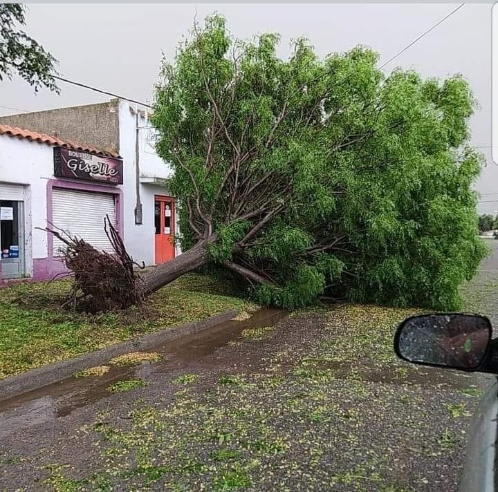 “Desde el cuartel salimos con tres dotaciones a tratar de paliar los problemas que han tenido los vecinos. Árboles caídos, voladuras de techos, una planta que aplastó un vehículo. La mayoría en el casco urbano de Darregueira. En la periferia, en el parque industrial también castigó bastante a un galpón de una empresa local pero por suerte, sin daños personales. Hubo abolladuras de vehículos y mucho lío con las plantas. Muchas ramas caídas y principalmente árboles. Es increíble cómo los arranca de raíz. En el complejo Barrio El Humo tienen un hermoso predio con un escenario techado que el viento le arrancó el techo limpito” señaló el Jefe bomberil a la vez que agregó que también se vio afectado el tendido eléctrico con la caída de postes y la interrupción del servicio que fue reestablecido cerca de las 19,30 hs.