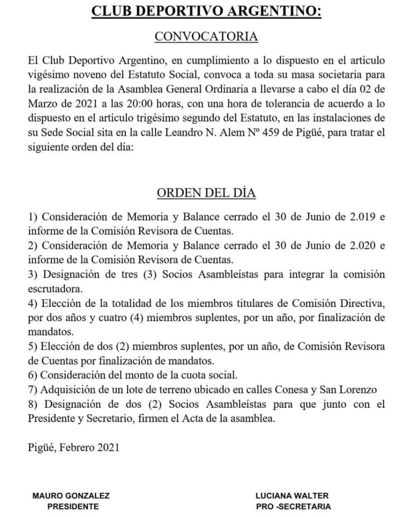 Información General 24 de Febrero de 2021 CLUB DEPORTIVO ARGENTINO El Club Deportivo Argentino convoca a Asamblea General Ordinaria a realizarse el 2 de marzo de 2021 a las 20 hs.en su sede social de Alem 459.