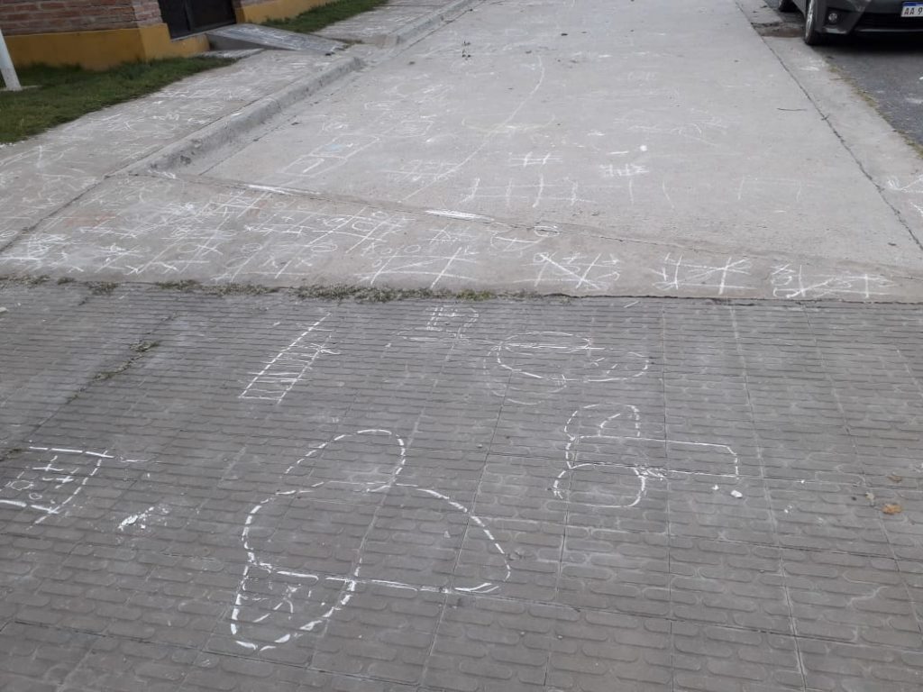 Los dibujos, escritura y materiales usados dan para pensar que pudieron ser chicos los autores de diferentes pintadas con tiza que aparecieron ayer en el ingreso al salón de usos múltiples y el taller protegiodo Nuevo Horizonte, ubicados en el barrio Jardín de Pigüé.