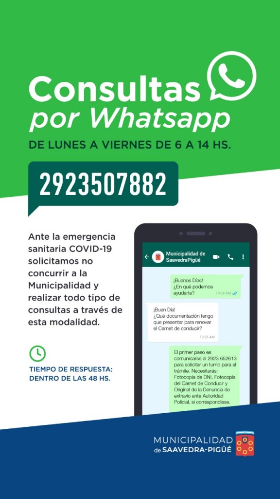 Ante la emergencia sanitaria COVID-19 solicitamos no concurrir a la Municipalidad y realizar todo tipo de consultas a través de la siguiente línea: 2923 – 507882 Las respuestas serán dadas dentro de las siguientes 48 hs.