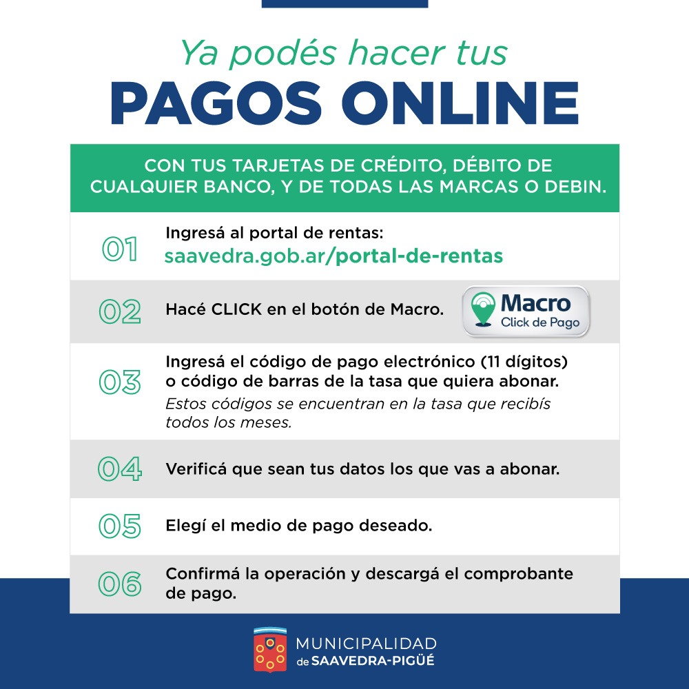 Información General 26 de Mayo de 2021 El municipio habilitó los pagos online Desde el municipio de Saavedra se ha comunicado que los contribuyentes ya pueden realizar sus pagos de manera online con tarjetas de crédito y débito de cualquier banco.