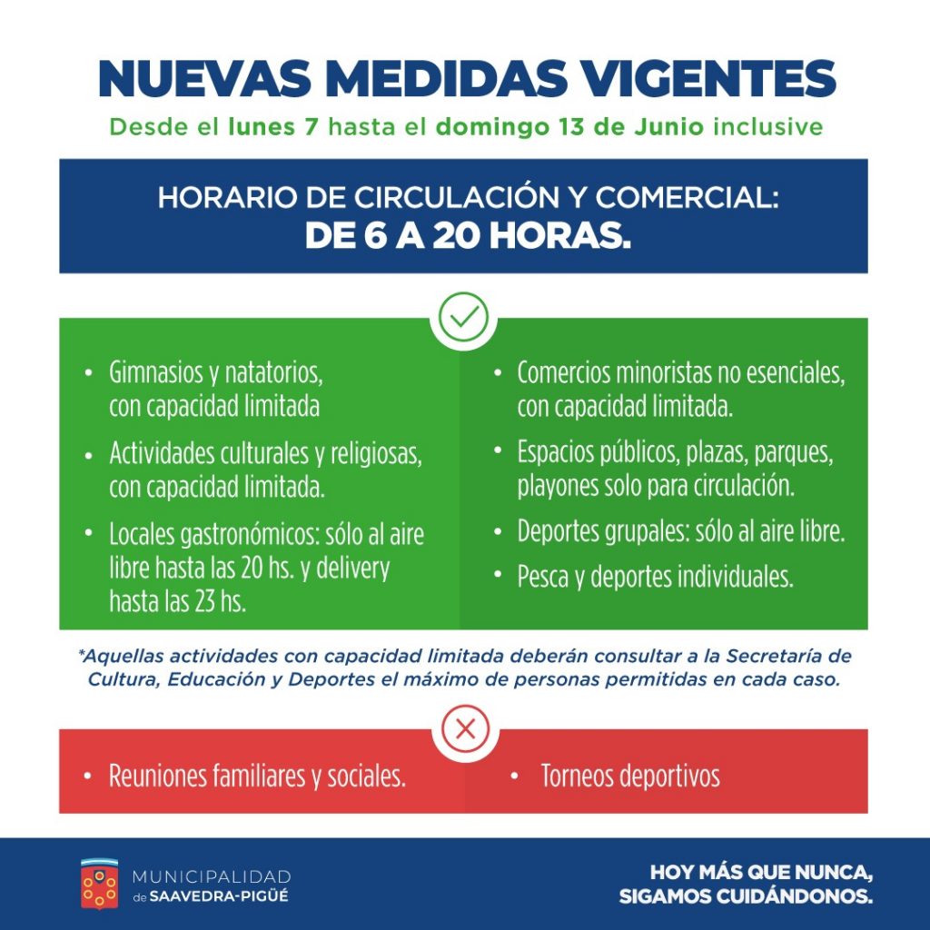 El intendente Gustavo Notararigo y las autoridades de salud anunciaron hoy las medidas sanitarias que regirán a partir de la hora cero de mañana lunes. "Si bien se ha notado una leve baja en los contagios, la situación del sistema hospitalario sigue siendo compleja y la liberación de camas en terapia intensiva, se sigue dando por fallecimientos" afirmó el intendente. Se habilitan algunas actividades con cupos. El horario comercial y de circulación continúa siendo el mismo.