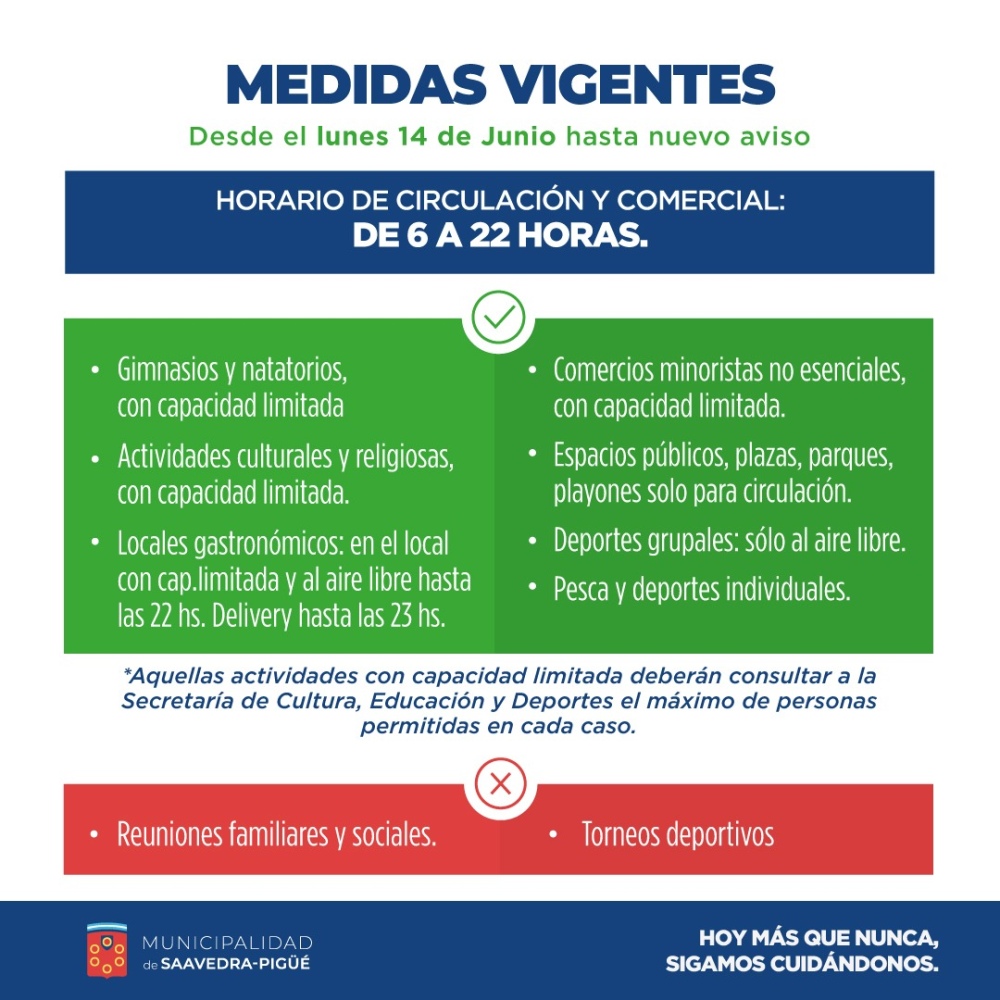 Hace instantes desde el Municipio informaron las nuevas medidas vigentes desde mañana 14 de Junio hasta nuevo aviso. Lo más destacado es la ampliación del horario de circulación y comercial que será desde las 6 a 22hs. y los locales gastronómicos con capacidad limitada podrán trabajar dentro del local y al aire libres hasta las 22hs. Hasta el momento las clases presencailes no son autorizadas por el Gobierno Provincial.