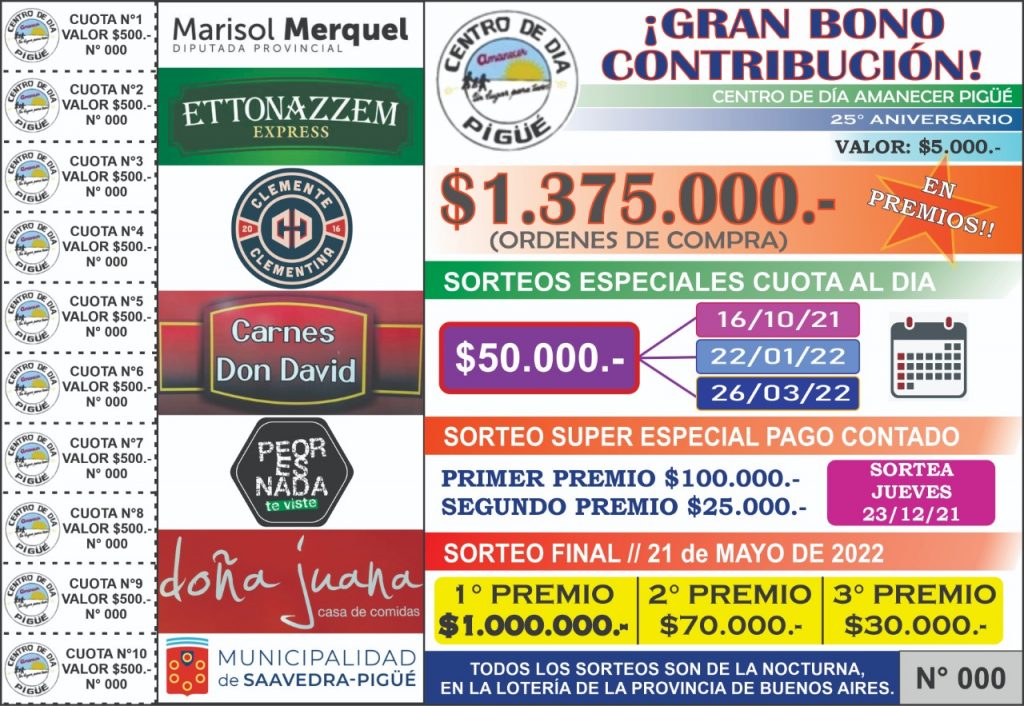 Integrantes del Centro de Día Amanecer anunciaron el lanzamiento de un bono contribución con importantes premios en efectivo, en total son $ 1.375.000 con un costo de $ 5.000 cada número que se puede pagar en 10 cuotas y con un sorteo final de $ 1.000.000 el 21 de mayo del año próximo, además de otros premios mensuales y por pago en efectivo.