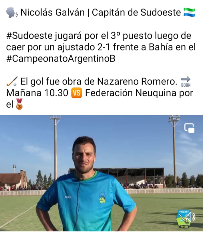 El equipo de la Federación de Hóckey del Sudoeste perdió ajustadamente 1-2 en semifinales con Bahía Blanca y mañana domingo jugará por el 3º puesto en el Campeonato Argentino B Sur de selecciones que se está disputando en Bahía Blanca.