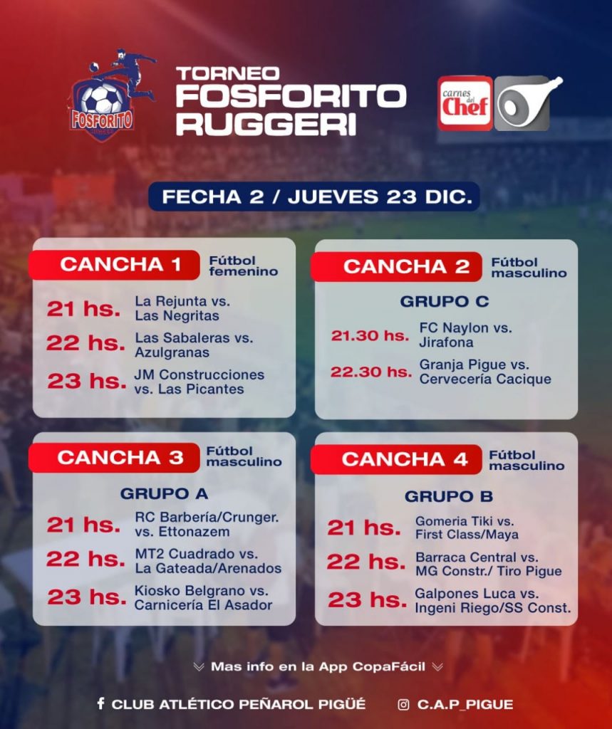 Los partidos comienzan a las 21 hs., cuatro canchas con tres turnos cada una, y se juega los lunes, miércoles y jueves con entrada libre y gratuita con un esmerado servicio de cantina y también con una barra de tragos que se preparan en el momento.