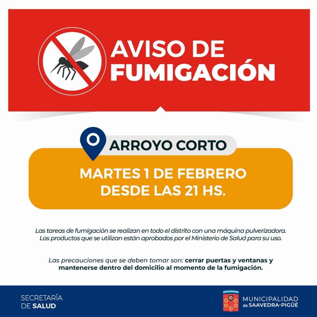 Se estará informando día y horario de fumigación en el resto de los barrios de Pigüé y localidades del distrito.