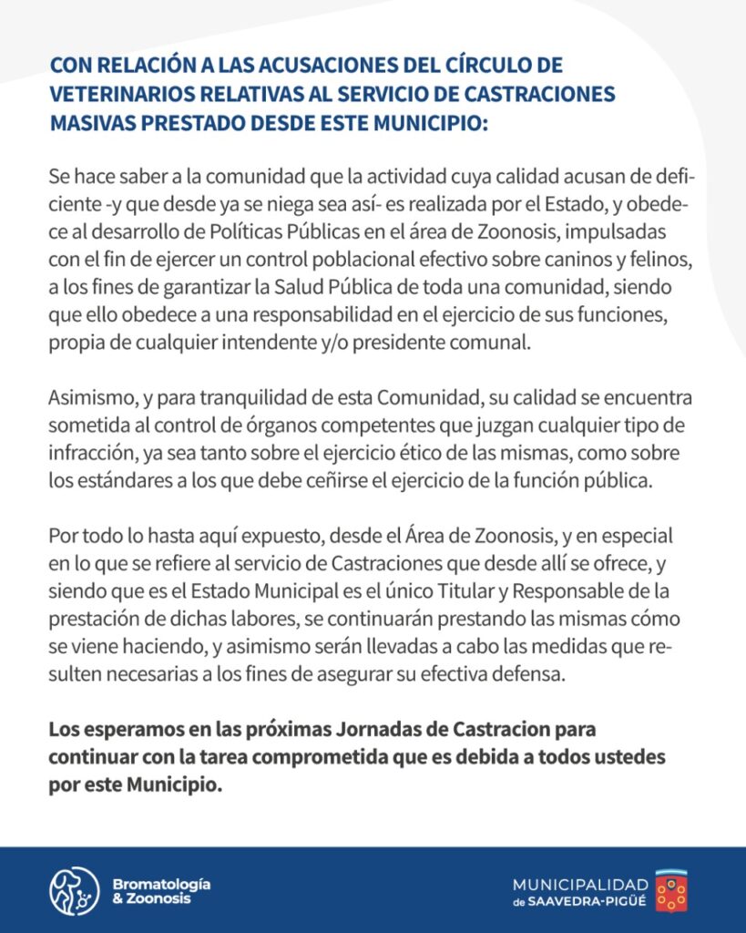 En un comunicado emitido hace instantes el municipio le respondió al Círculo de Veterinarios de Pequeños Animales desde dónde hoy se advirtió a la población sobre "riesgo de vida para los animales" al cuestionar la metodología utilizada en las castraciones que realiza zoonosis.