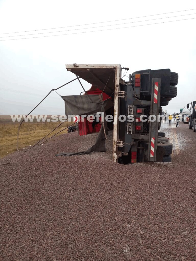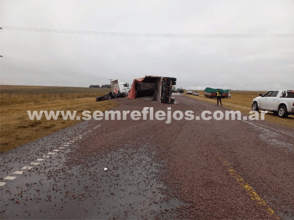 Uno de los camiones que transportaba piedras volcó su acoplado sobre la ruta, mientras que otro fue a dar a la banquina, sin vuelco. El cisterna quedó detenido sobre la ruta y un cuarto camión que circulaba adelante del resto al momento del choque, también quedó frenado sobre la cinta asfáltica. El vehículo que más daños sufrió fue el auto que también finalizó detenido en medio de la ruta entre los camiones.