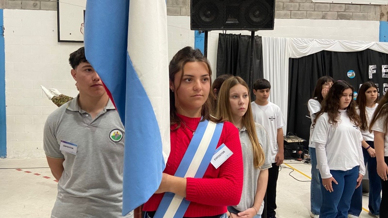 Representando al distrito de Saavedra ingresó la Bandera de Ceremonia del CEF N°83 de Pigüé, portada por Mía Scarpellino y escoltada por Julieta Calmens y Francisco Lau, junto a las banderas de distintos distritos de la región. El Himno Nacional Argentino fue interpretado por la Banda Militar de Cura Malal, con acompañamiento en lenguaje de señas por estudiantes de la Escuela Secundaria N°6 de Dufaur.